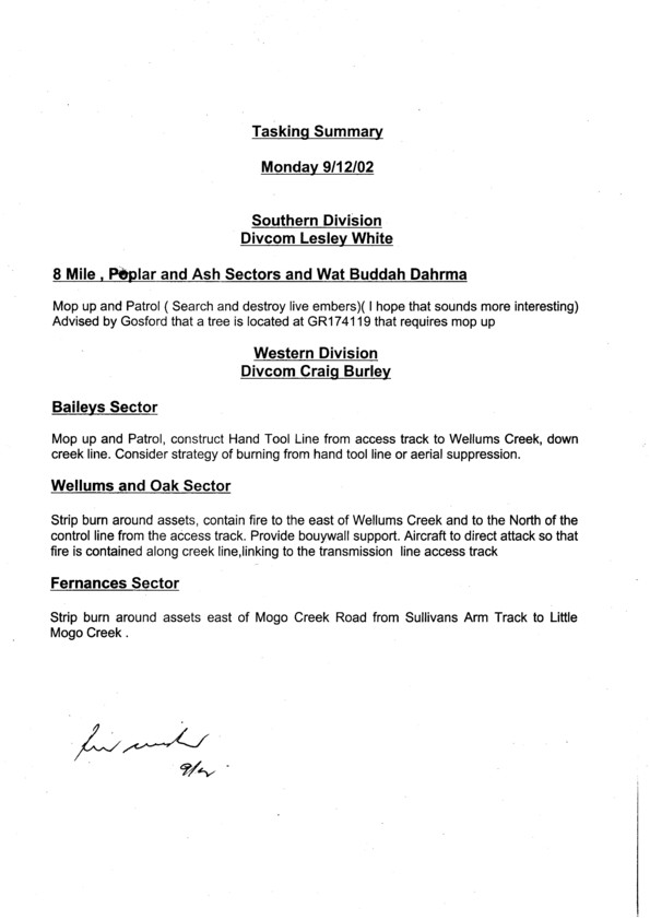 Tasking Summary Sheet for 9.12.02
