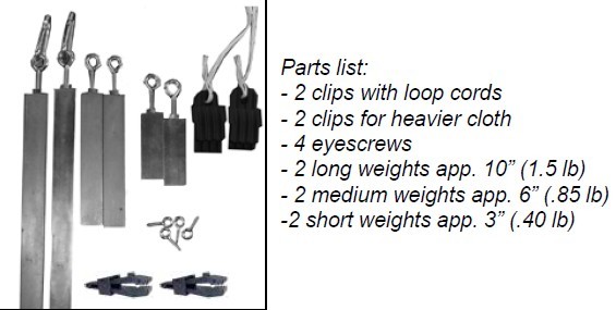 Comes with 3 sets of weights (use individually or combine to suit), 2 sets of clips (one for heavy, one for light, cord and screw eyes.