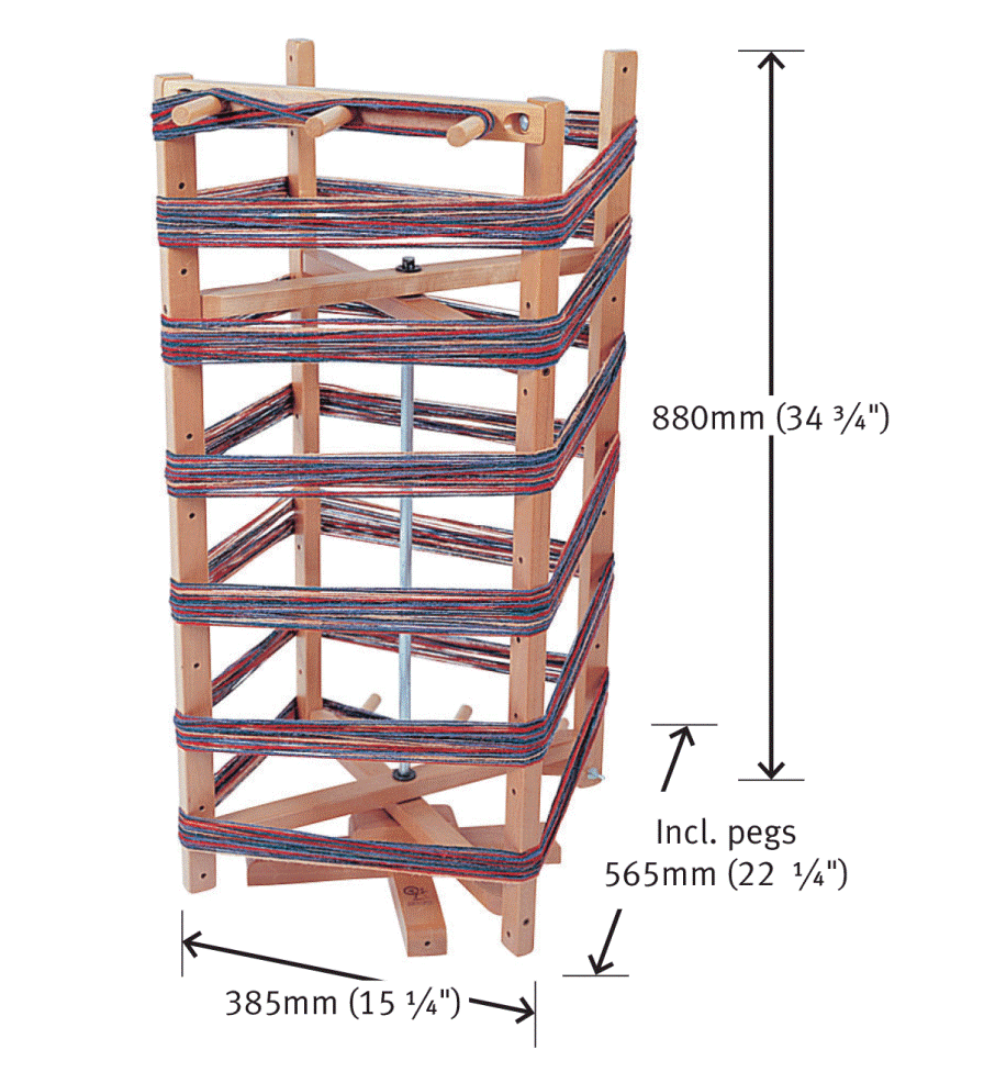 This rotating mill is for quick and easy warping with the strain taken by the strong uprights and not the pegs. The bars holding the cross pegs are moveable, so any length can be wound up to approximately 15m (50ft).